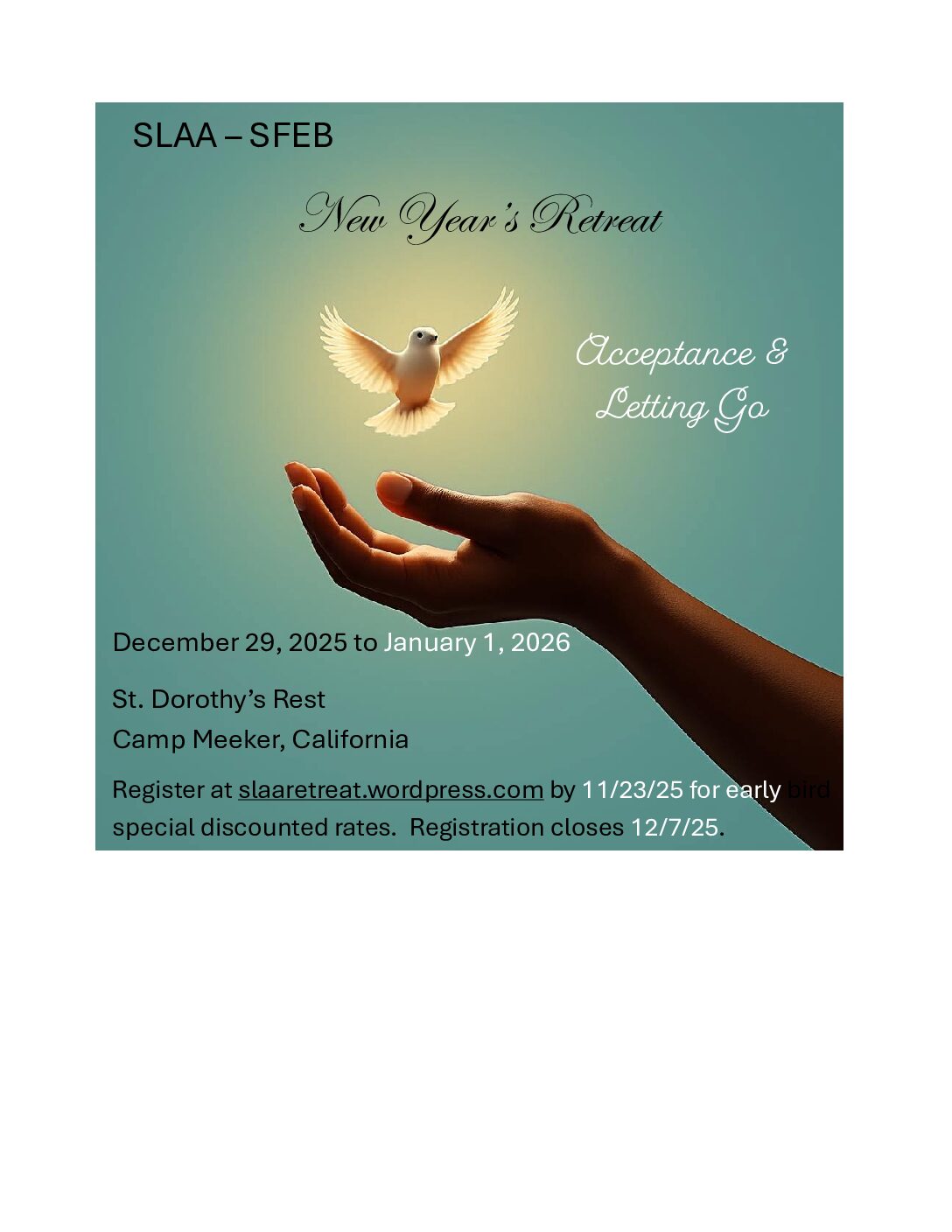 The annual SFEB SLAA New Year’s Retreat 2026 will be at St. Dorothy’s Rest located among old-growth redwoods and perched high on a hilltop above the Pacific Ocean in Sonoma County. We are looking forward to welcoming those seeking recovery and rejuvenation.